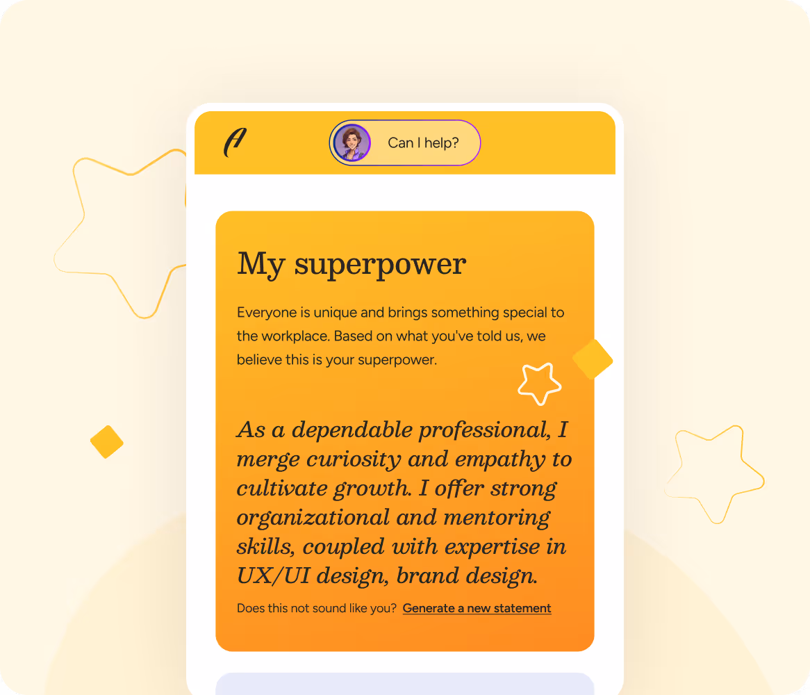 If you’ve had a long career, or worked in one organisation a while, it’s easy to lose track of your skills. Most people can’t articulate the range of skills they have, or easily recall the powerful work experiences that position them for promotion. Our algorithim sorts most of it, and we guide you to get it right.